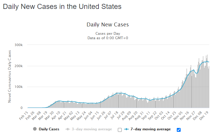 New cases and hospitalizations continue to rise across the country. The U.S. saw a record high 251,000 new cases on 18 December. Over the past week, there has been an average of 216,000 cases per day, an increase of seven percent from the average two weeks earlier. Hospitalizations are up 13 percent across the country compared to the same period two weeks ago. At least 115,000 Americans are hospitalized with COVID-19.