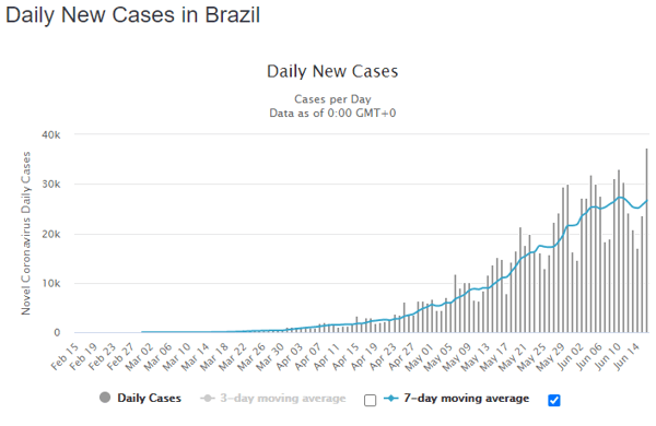 - Brazil's outbreak continues to worsen. The country recorded over 35,000 new cases over the last day, bringing the total to nearly 1,000,000.