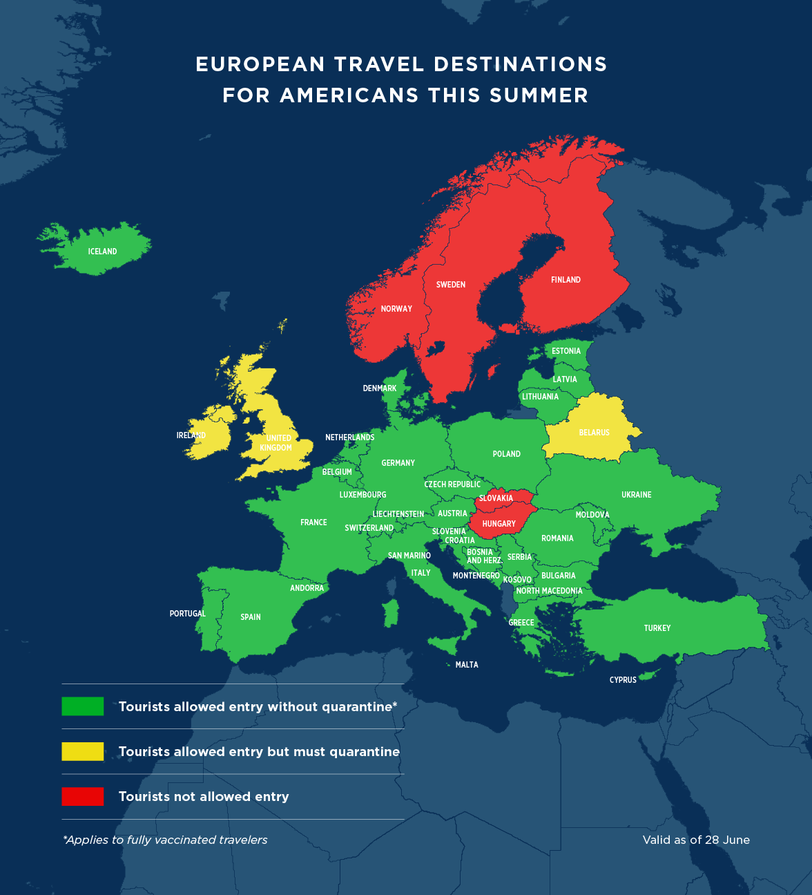 Ready to get back to travel? The good news is that after a long wait, Europe has finally opened its doors to American tourists. Global Guardian's Intelligence Analysts have created a map for easy reference for those planning a European getaway this summer.