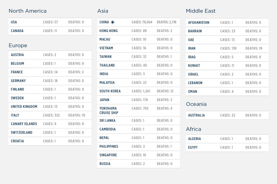 While trends in China are overall positive, the surge in cases in South Korea, Japan, and Italy are concerning and have already led to increased travel restrictions across Europe and APAC. Additional new cases in Brazil, Algeria, Austria, Switzerland and elsewhere highlight how quickly COVID-19 can spread.