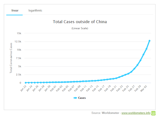 See below graphs from Worldometers highlighting rapid growth of cases outside China: